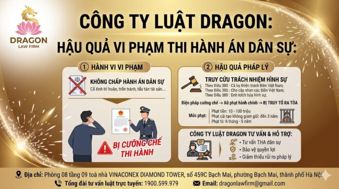 Luật sư tại Công ty luật Dragon nhấn mạnh rằng hành vi không chấp hành có thể dẫn đến các hệ lụy lâu dài, bao gồm mất uy tín và tài chính. Ví dụ, một cá nhân không thực hiện án trả nợ có thể bị phong tỏa tài sản, ảnh hưởng đến cuộc sống hàng ngày.  Tư vấn pháp lý về thi hành án  giúp khách hàng hiểu rõ các lựa chọn, từ đàm phán đến kháng cáo nếu có cơ sở.